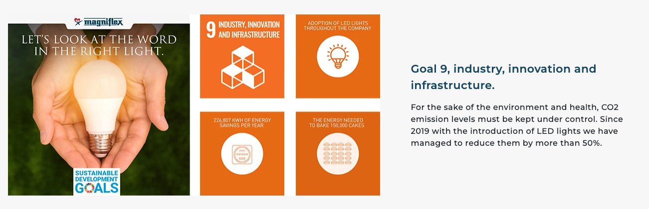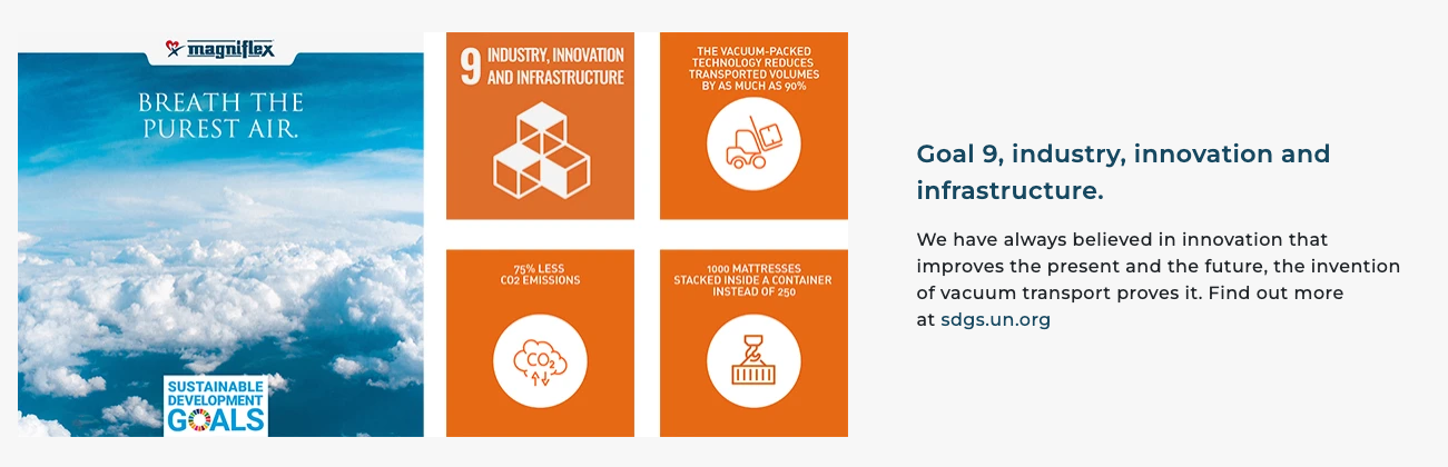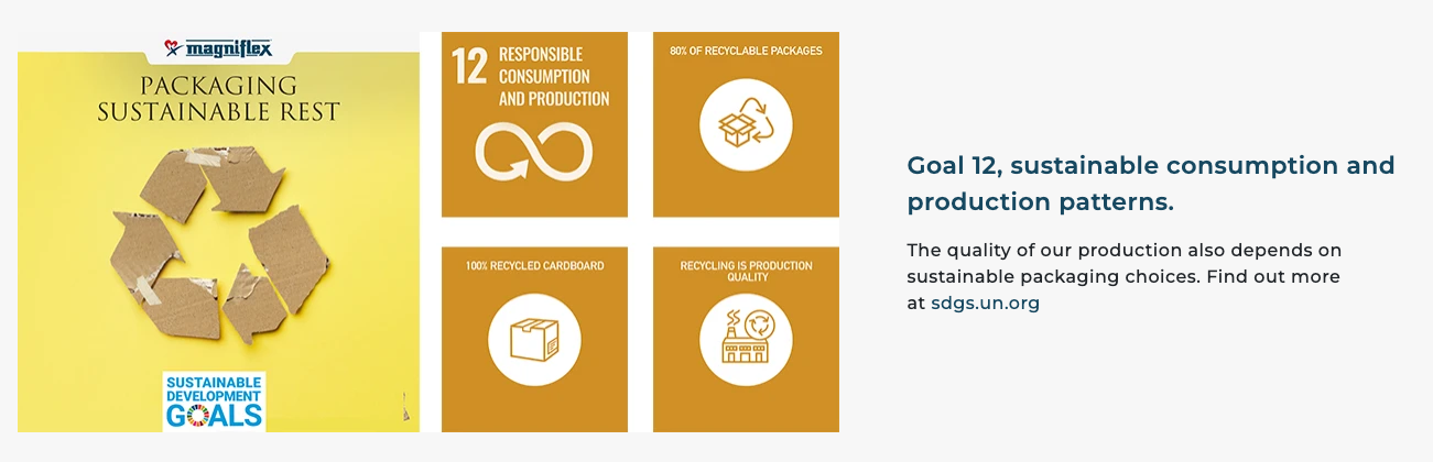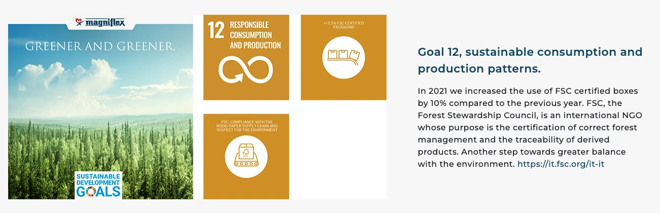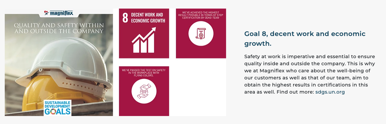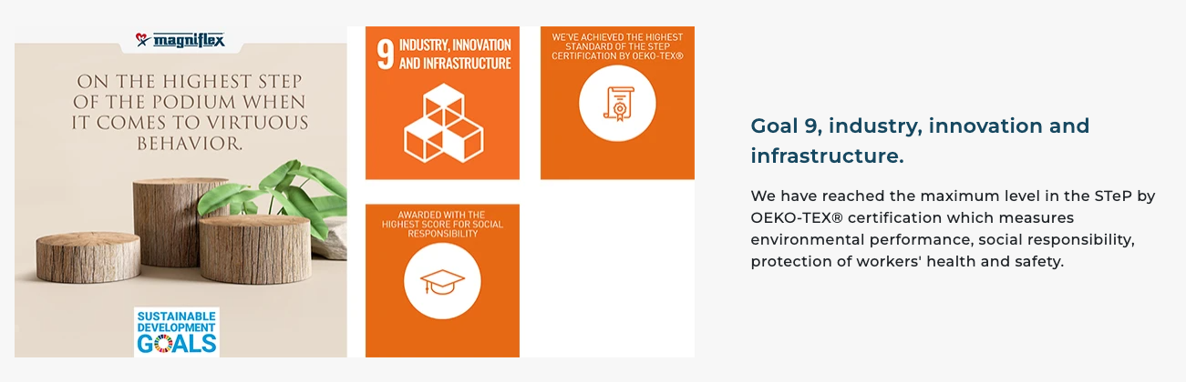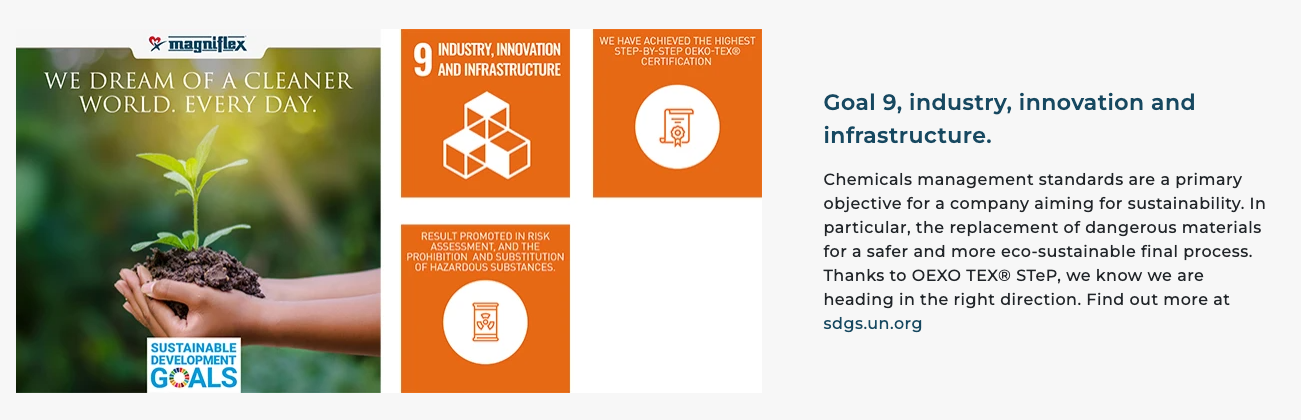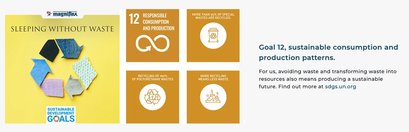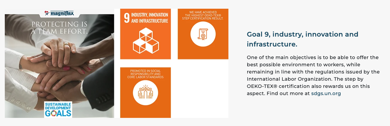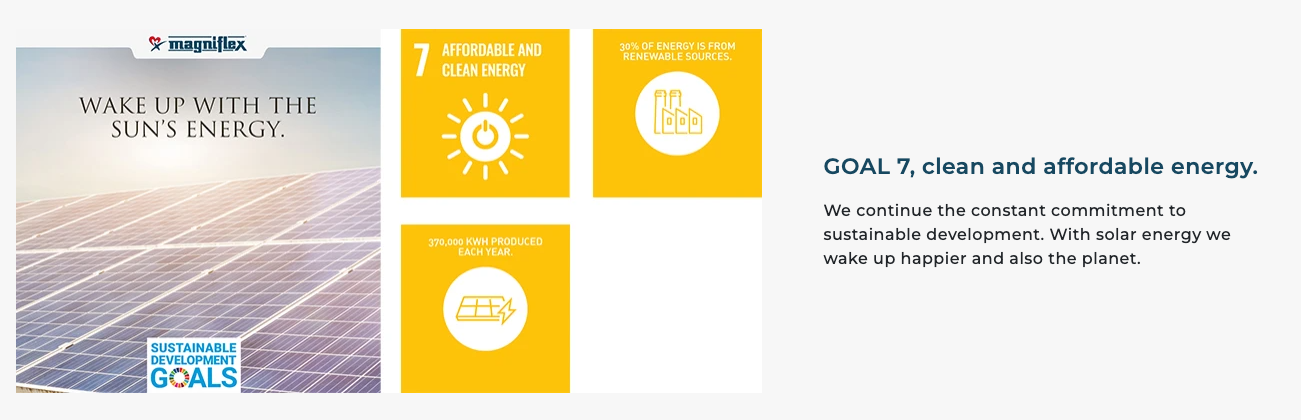 Magniflex është nënshkruar për projektin ambicioz të Kombeve të Bashkuara për Objektivat e Zhvillimit të Qëndrueshëm, i cili synon të arrijë 17 synime deri në vitin 2023. 17 objektiva që janë thelbësore për të siguruar që të gjithë banorët e Tokës të kenë një të ardhme më të mirë dhe më të qëndrueshme. Është një projekt që përfshin sektorë të ndryshëm socialë dhe ekonomikë, që synon përmirësimin e kushteve të jetesës për të gjithë. Garantimi i aksesit në burime dhe ruajtja e mjedisit dhe klimës, në mënyrë që brezat e ardhshëm të zgjohen çdo ditë në një botë më të banueshme.